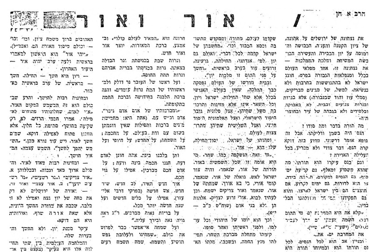 Israel celebrates the victory of Jerusalem over Athens, of small and impoverished Zion over mighty and wealthy Greece, not through the clashing of swords and not by bearing gleaming shields. It celebrates this wonder of history and marvel of heroism with flames. Quiet flames, kindled in the home. Not with torches and flares, and not in the public squares or upon the city heights.